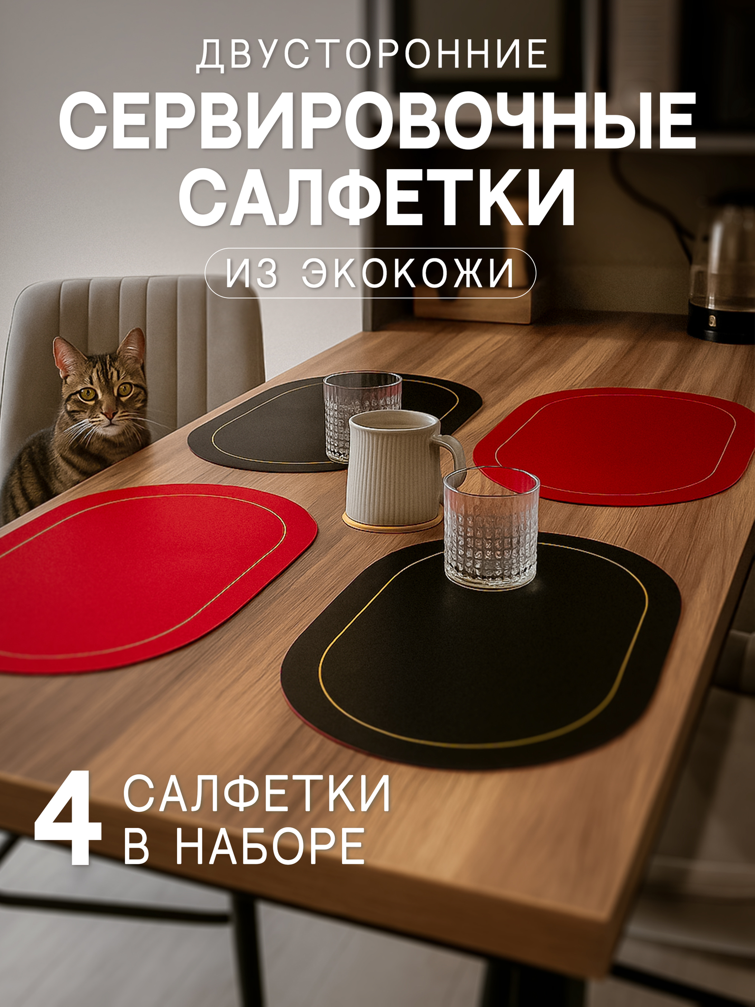 Двусторонние сервировочные салфетки из искусственной кожи — стильное и практичное решение для сервировки обеденного или рабочего стола. Набор состоит из 4 салфеток, каждая из которых имеет две стороны: одна красная, другая черная. Это позволяет легко менять настроение и оформление интерьера без дополнительных затрат.