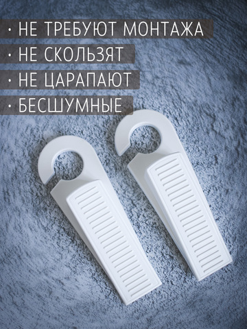 Удобные, безопасные стопперы для фиксации дверей и окон, не требующие крепления. Ограничители мягко и бесшумно защищают двери от случайного закрывания, ударов о мебель и стены. Стопперы изготовлены из гибкого ПВХ, не царапают, не скользят, надежно фиксируют положение.